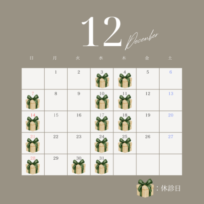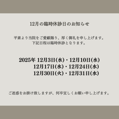 誠に勝手ながら、年末年始は以下の期間を休診とさせていただきます。